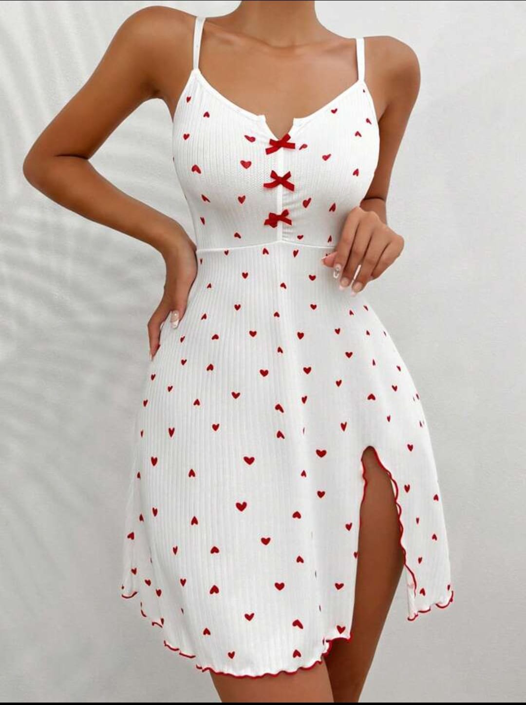 Ağ bantlı ürəkli model Türkiyə istehsalı, ağ rəngli, qırmızı ürək naxışlı və bant detallı yırtmaclı fantazi gecəlik. Ölçülər: S, M, L, XL. Bizi Instagram və TikTok-da izləyə bilərsiz.