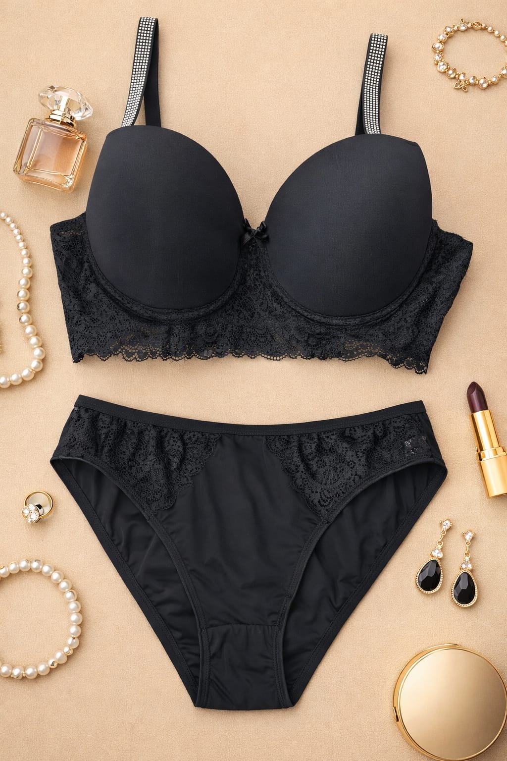 Alt geyim dəsti qara krujevalı Daşlı askıları və zərif krujeva işləmələri ilə diqqət çəkən bu qara alt geyim dəsti, həm şıklığı, həm də rahatlığı bir arada axtaranlar üçündür. 90, 95, 100 və 105 B ölçüləri mövcud olan bu keyfiyyətli dəstlə özünüzü hər an inamlı hiss edəcəksiniz. Bizi Instagram və TikTok-da izləyə bilərsiniz.