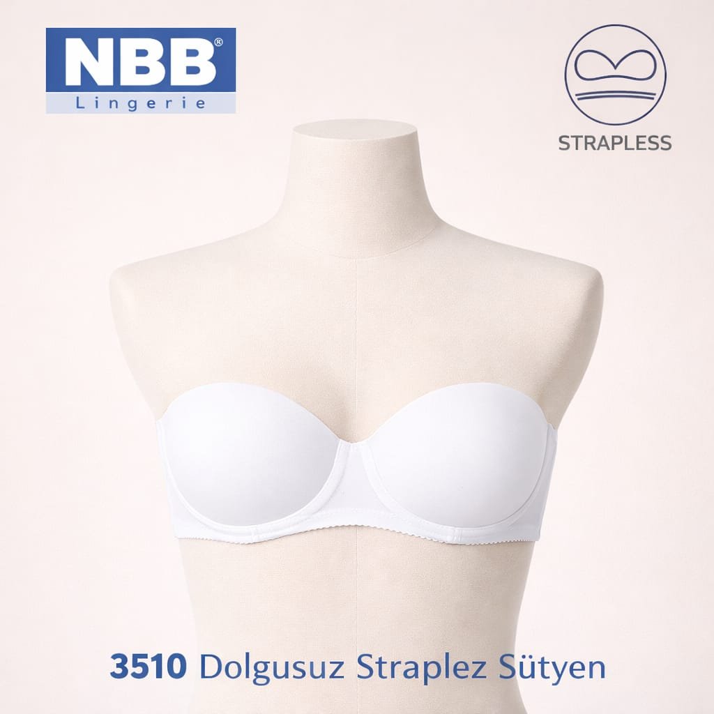 Büstqalter 3510 dolgusuz straplez NBB 3510 dolgusuz və straplez büstqalter modeli, 75B, 80B və 85B ölçülərində mövcuddur. Çıxarıla bilən askıları və iz qoymayan yumşaq parçası ilə hər cür paltar altında estetik görünüş yaradır. Həm rahat, həm də çoxfunksiyalı alt paltarı axtaranlar üçün mükəmməldir. Bizi Instagram ve TikTok-dan izleye bilersiz.