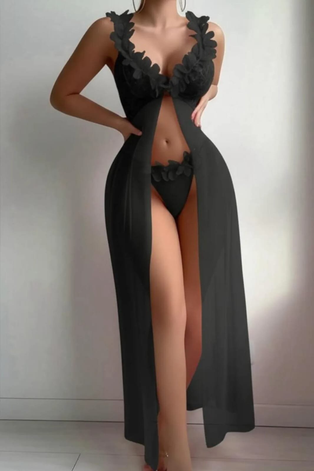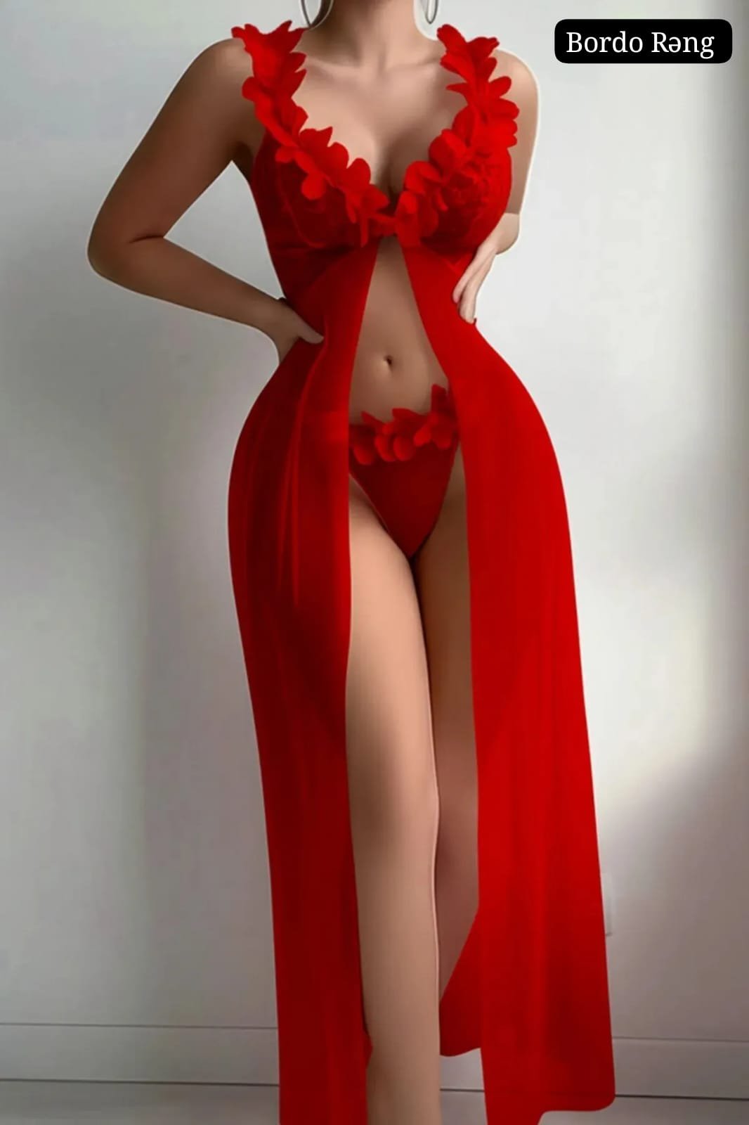 Qabarıq gül detalları və şəffaf ağ tüllə hazırlanmış bu uzun gecəlik, zərif və ehtiraslı görünüşü birləşdirir. Özəl anlarında fərqlilik axtaran xanımlar üçün ideal seçimdir. Ölçülər: S, M, L, XL Bizi Instagram və TikTok-da izləyə bilərsiniz.