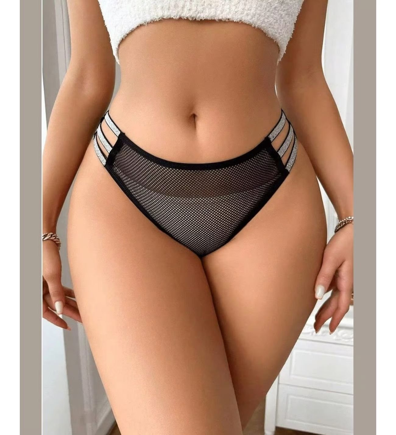 Fantazi bantlı model Bu zərif fantazi alt geyimi həm cəlbedici, həm də müasir dizaynı ilə seçilir. Ön hissəsinin torlu quruluşu və yan tərəflərindəki parıltılı üçlü bant detalları bədən xətlərinizi incə şəkildə vurğulayır. Keyfiyyətli və elastik materialı sayəsində bədənə mükəmməl oturur və gün boyu narahatlıq yaratmadan özünüzü inamlı hiss etməyinizə kömək edir. İstər gündəlik, istərsə də xüsusi anlar üçün ideal olan bu model, qarderobunuza fərqli bir rəng qatacaq.