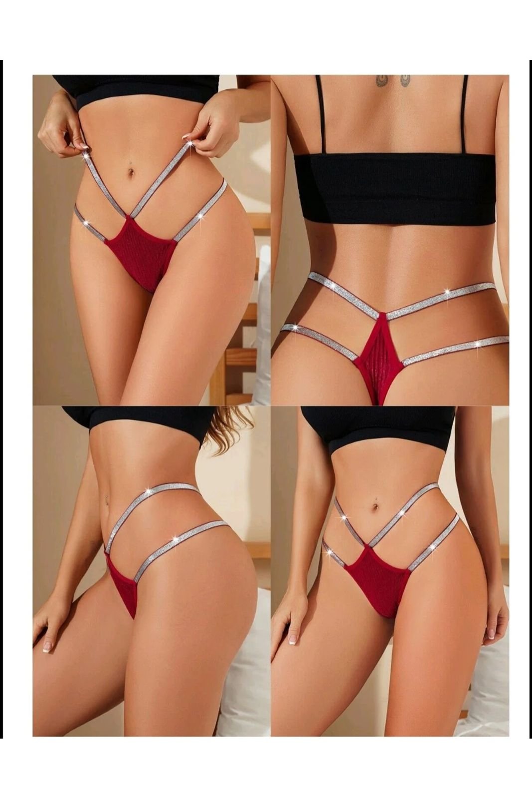 Fantazi gümüşü bantlı model Bu iddialı fantazi alt geyimi ehtiraslı qırmızı rəngi və bədən xətlərini qeyri-adi şəkildə vurğulayan gümüşü parıltılı bantları ilə fərqlənir. Yüksək bel və açıq dizaynı sayəsində bədən quruluşunu daha zərif və cəlbedici göstərir. Yumşaq və elastik materialdan hazırlanan bu model hər bir hərəkətinizdə maksimum rahatlıq təmin edərək özünüzü həm şıq, həm də inamlı hiss etməyinizə şərait yaradır. Xüsusi anlar üçün qeyri-adi bir seçim axtaranlar üçün bu model mükəmməl bir parçadır.
