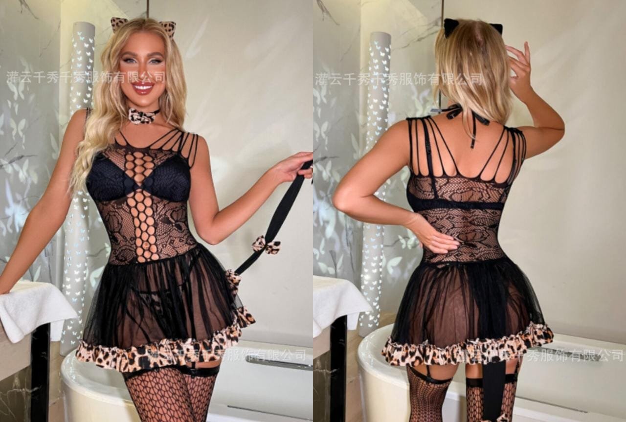 Fantazi leopar detallı pişik kostyumu Leopar naxışlı abadok (qulaqcıq) və tor corab daxil olmaqla tam şəkildə təqdim olunan qara tüllü fantazi pişik kostyumu. Bədənə rahat oturan elastik krujeva parçadan hazırlanıb, cəlbedici və əyləncəli dizayna malikdir. Bizi Instagram və TikTok-da izləyə bilərsiniz.