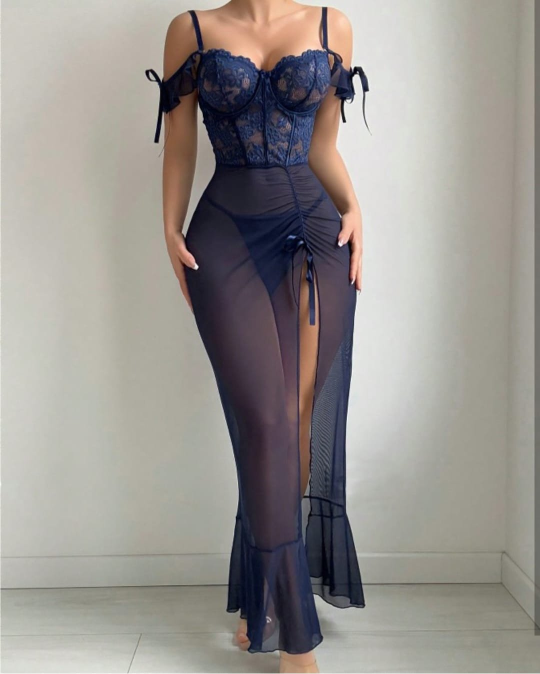 Fantazi qara uzun Bu möhtəşəm qara fantazi gecəlik, üst hissəsindəki zərif güpür naxışları və yerə qədər uzanan şəffaf tül ətəyi ilə əsl zəriflik nümunəsidir. Sinə hissəsindəki dəmirli (balenli) struktur bədəni dik tutaraq daha cazibədar bir forma yaradır, dərin yarıq detalı isə addımlarınıza dinamiklik və şarm qatır. Çiyin hissəsindəki incə fırfırlı kəsimlər və bədəni saran elastik tül parçası sayəsində həm çox rahat, həm də olduqca iddialı bir görünüş təmin edir. Xüsusi gecələrdə özünü kraliça kimi hiss etmək istəyən xanımlar üçün bu uzun tüllü model mükəmməl bir seçimdir.