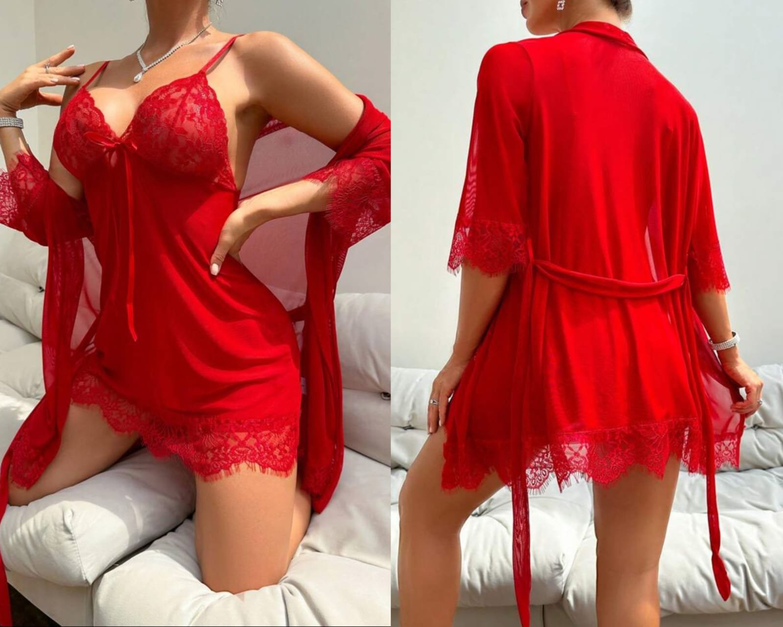 Fantazi qırmızı tüllü İncə krujeva detallı, qırmızı tül gecəlik və sabahlıq dəsti. Həm şık, həm də cazibədar dizayna malikdir. Ölçülər: M, L, XL Bizi Instagram və TikTok-da izləyə bilərsiniz.