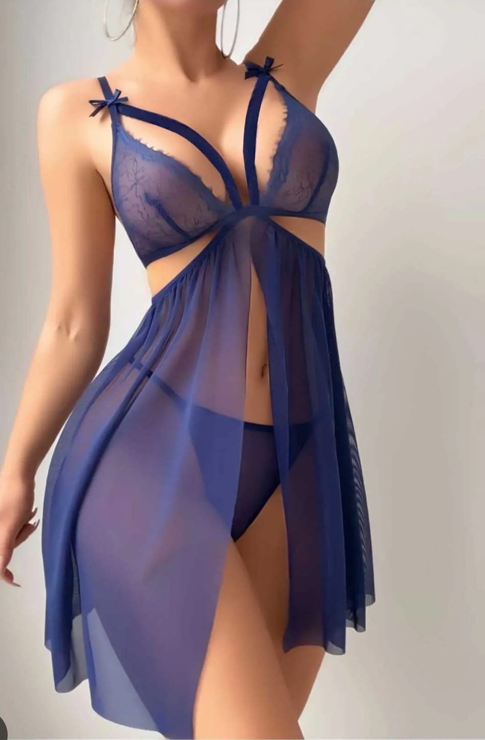 Fantazi tünd göy tullu Tünd göy rəngli, krujeva və lent detallı şəffaf tül gecəlik. S, M, L və XL ölçüləri mövcud olan bu şık dəst, bədən quruluşunu ön plana çıxaran cəlbedici dizayna malikdir. Bizi Instagram və TikTok-da izləyə bilərsiniz.