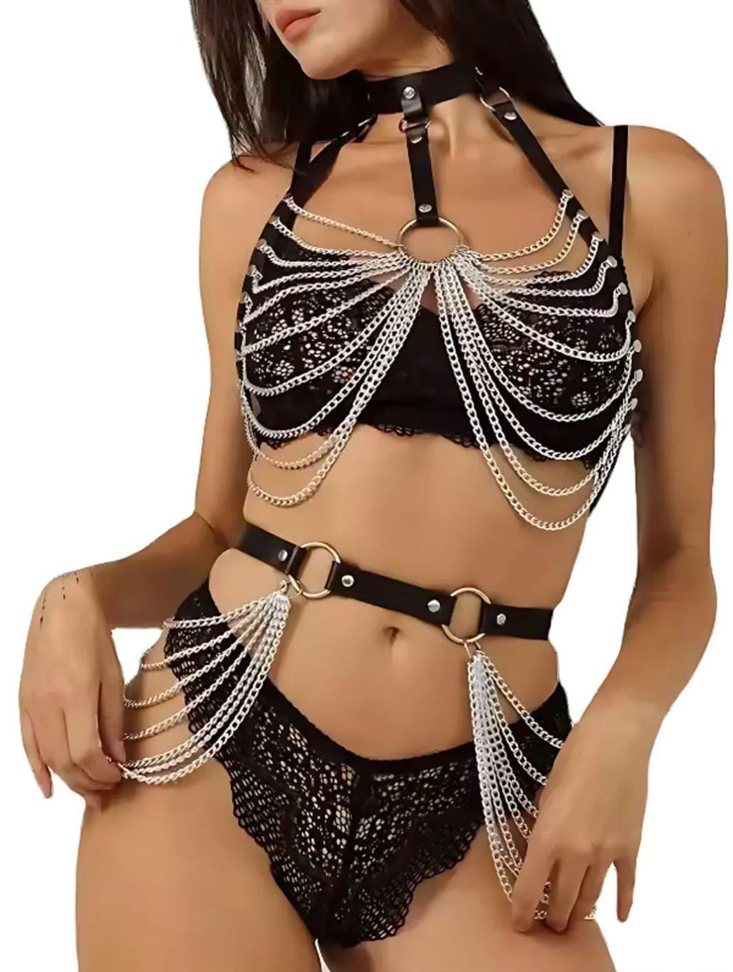 Fantazi zəncirli krujeva dəst Türkiyə istehsalı olan bu eksklüziv fantazi dəst, krujeva detalları ilə gümüşü rəngli çoxqatlı zəncir aksesuarlarının mükəmməl vəhdətindən ibarətdir. Boyundan bağlanan dəri kəmər və sinə hissəsini bürüyən sallanan zəncirlər bədən quruluşuna vizual olaraq həcm və cəlbedici parlaqlıq qatır. Yüksək bel kəsimli alt geyimi və yan tərəflərdən süzülən zəncir detalları bədən xətlərini daha estetik və iddialı göstərmək üçün dizayn edilib. Həm aksesuar zənginliyi, həm də bədənə tam oturan elastik quruluşu ilə xüsusi və fərqli üslub axtaranlar üçün ideal seçimdir.