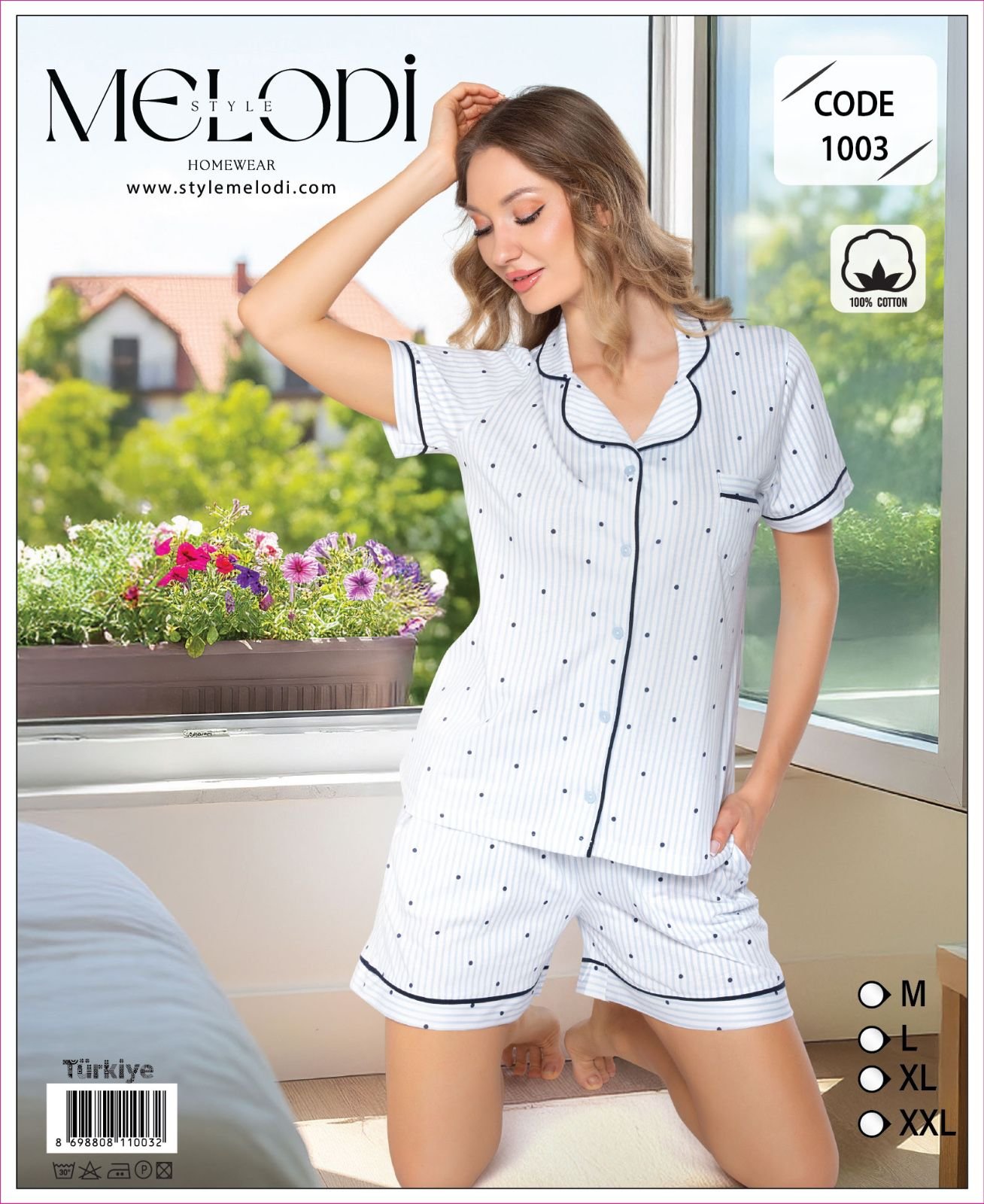 Pijama Melodi 1004 Melodi markasından 100% pambıq tərkibli, zolaqlı və xallı dizayna malik şortlu pijama dəsti. Yumşaq teksturası və düyməli üst hissəsi ilə yay gecələri üçün mükəmməl rahatlıq təmin edir. M, L, XL və 2XL ölçüləri mövcuddur. Bizi Instagram və TikTok-da izləyə bilərsiniz.