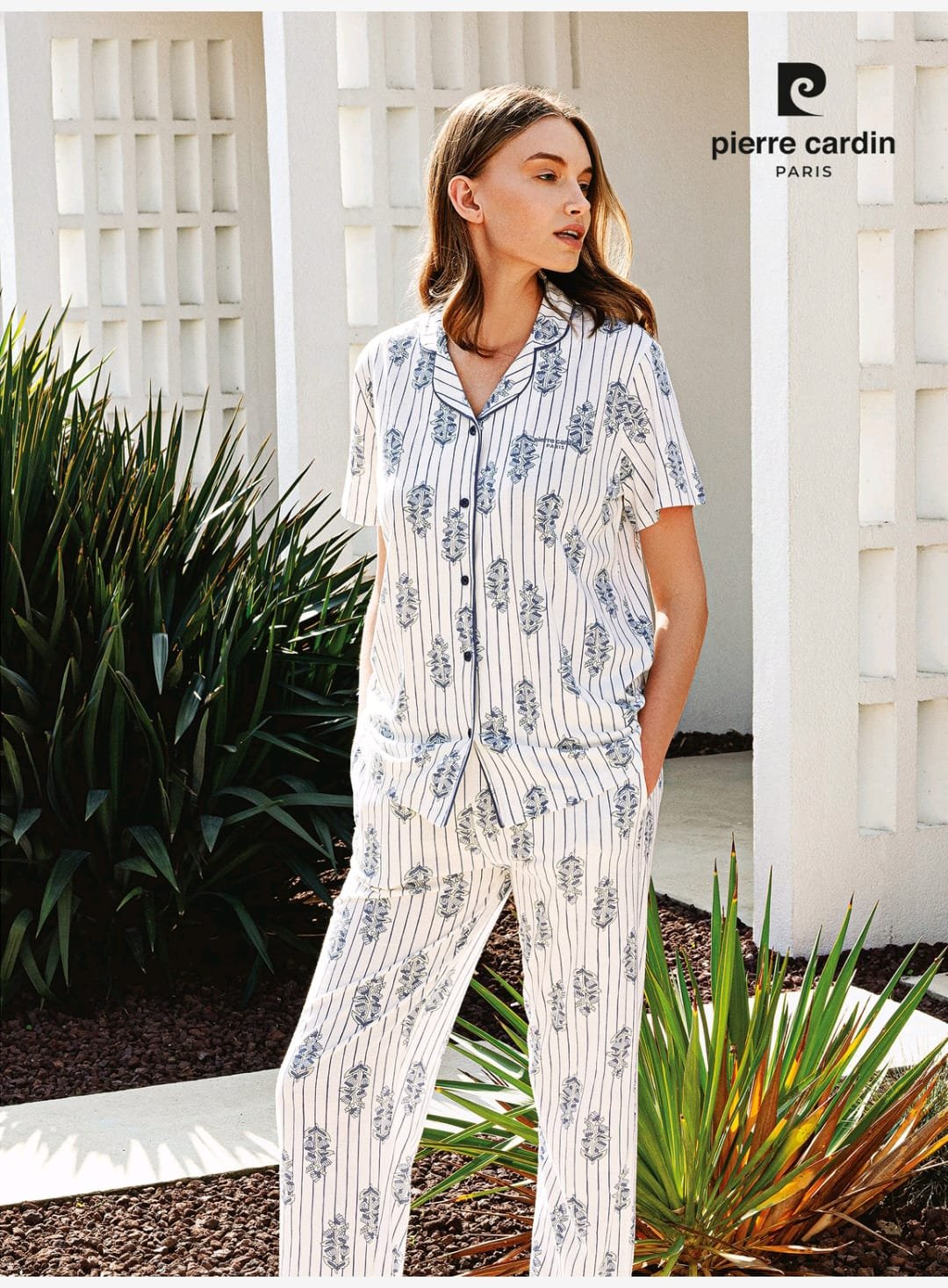 Pijama Pierre Cardin naxışlı Pierre Cardin brendinin bu özəl pijama dəsti, klassik zolaqlar və zərif göy naxışların vəhdəti ilə ev geyimində fərqlilik yaratmaq istəyən qadınlar üçün dizayn edilib. Yüksək keyfiyyətli pambıq və modal qarışımlı parçası dərinizə maksimum rahatlıq verir, təbii tərkibi sayəsində gün boyu fərahlıq təmin edir. Düyməli üst hissəsi və geniş kəsimli şalvarı həm yuxu zamanı konforu artırır, həm də ev daxilində şık bir görünüş bəxş edir. Keyfiyyətli tikişləri və Pierre Cardin-in dünya standartlarına cavab verən parça strukturu sayəsində bu dəst uzunmüddətli istifadə üçün ideal seçimdir.