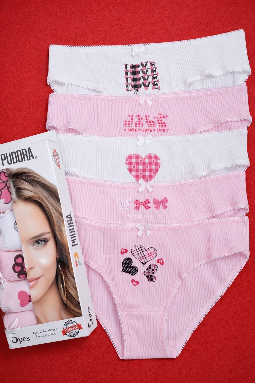 Puddra 5-li alt paltarı Yüksək keyfiyyətli pambıq materialdan hazırlanmış Puddra brendinə məxsus bu 5-li alt paltarı dəsti, gündəlik istifadə üçün həm rahatlıq, həm də rəngarənglik vəd edir. Dəstə daxil olan fərqli rənglərdəki modellər üzərindəki şirin yazılar və incə bant detalları ilə zərif bir görünüşə malikdir. Nəfəs alan və yumşaq trikotaj parçası sayəsində gün boyu bədəninizə maksimum komfort təmin edir və dərinizi qıcıqlandırmır. Azərbaycanın ən çox seçilən qadın alt geyimi markalarından olan Puddra-nın bu özəl paketi, həm keyfiyyəti, həm də münasib qiyməti ilə icgeyim.az saytında sizin üçün təqdim olunur. 95% pambiq.