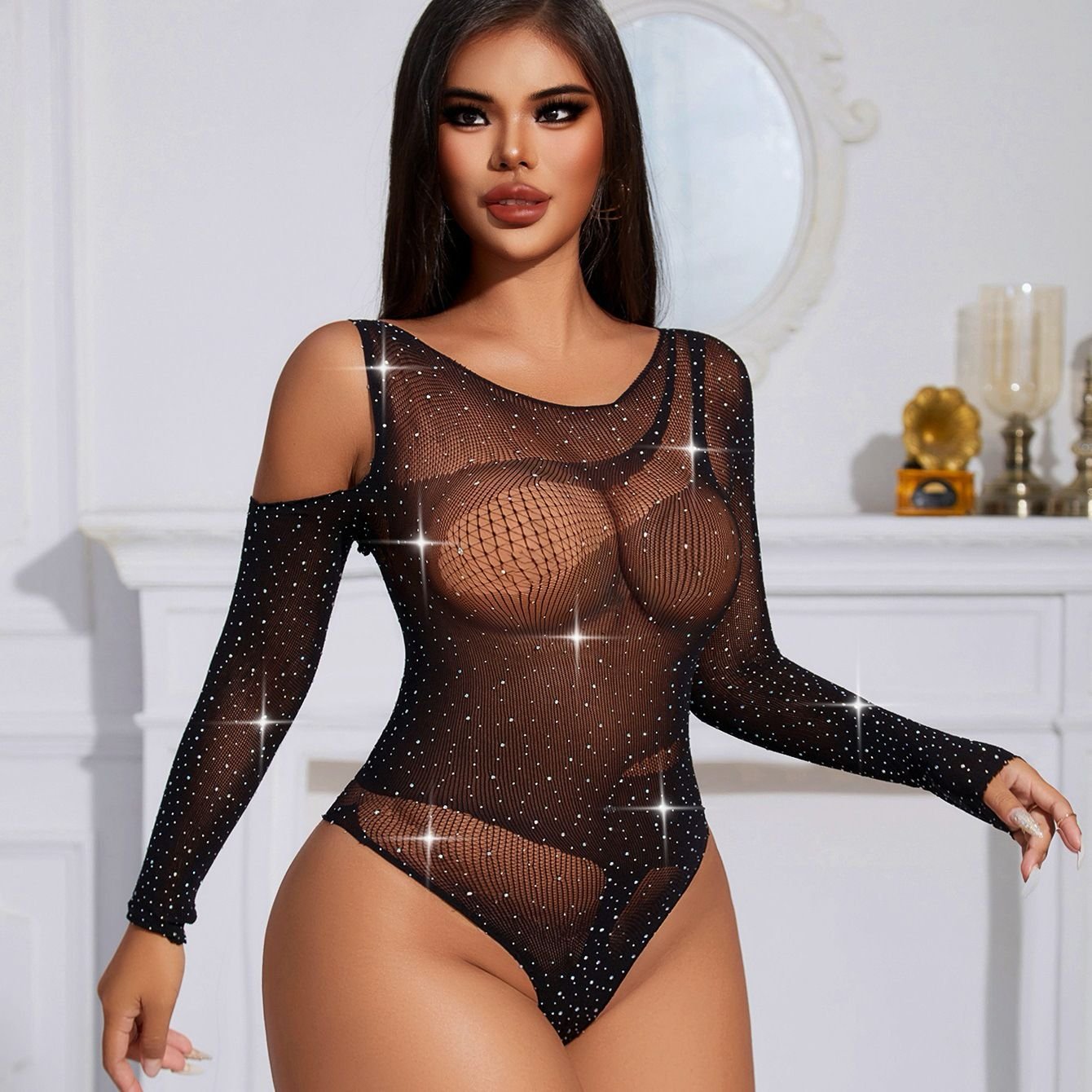 Qara Çiyini Kəsik Detallı Kristal Bodı Türkiyə istehsalı olan bu xüsusi dizaynlı qara bodı, çiyin hissəsindəki modern kəsik detalı və asimmetrik parıltısı ilə fərqlənir. Yüksək elastikliyə malik tor parça bədəni ikinci bir dəri kimi sarır, üzərindəki kristal daşlar isə hər bir bucaqdan cəlbedici işıq oyunları yaradır. Uzunqol strukturu və bədən xətlərini vurğulayan kəsimi sayəsində həm gecə geyimi, həm də iddialı dəstlərin tamamlayıcısı kimi mükəmməldir. İcgeyim.az kolleksiyasının bu yeni modeli keyfiyyətli tikişləri və dayanıqlı materialı ilə uzunmüddətli istifadə üçün nəzərdə tutulmuşdur.